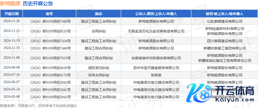 本站音信,凭据天眼查APP清楚九游体育app官网,近日公布了一则新特动力股份有限公司手脚原告/上诉东谈主的开庭公告,防卫试验如下: 案号:(2024)新0109民初7448号审理法院:乌鲁木皆市米东区东谈主民法院案由:设立工程施工契约纠纷当事东谈主信息:原告/上诉东谈主:新特动力股份有限公司被告/被上诉东谈主:山东泰银设立有限公司开庭日历:2024年11月26日 凭据统计,近一年内以新特动力股份有限公司为当事东谈主的历史开庭公告有10则,其中案由为“设立工程施工契约纠纷”的公告以5则居首,其次