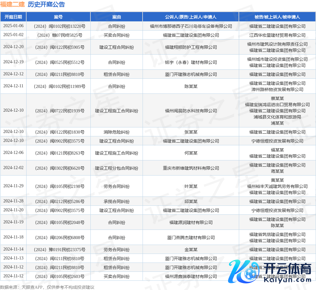 本站音书,把柄天眼查APP显现,近日公布了一则福建省二建成就集团有限公司四肢被告/被上诉东说念主的开庭公告九游体育娱乐网,详备本体如下: