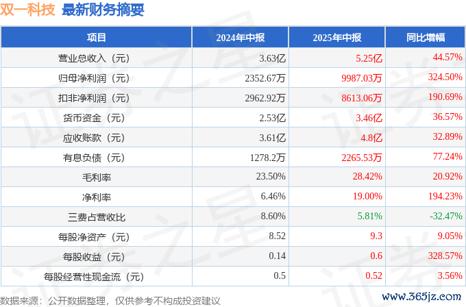 据本站公开数据整理,近期双一科技(300690)发布2025年中报。适度本请问期末,公司生意总收入5.25亿元,同比高潮44.57%,归母净利润9987.03万元,同比高潮324.5%。按单季度数据看,第二季度生意总收入3.32亿元,同比高潮42.75%九游体育娱乐网,第二季度归母净利润6959.53万元,同比高潮239.4%。本请问期双一科技应收账款高潮,应收账款同比增幅达32.89%。 本次财报公布的各项数据标的进展尚佳。其中,毛利率28.42%,同比增20.92%,净利率19.0%,同比