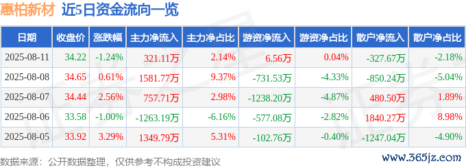 本站音信,实现2025年8月11日收盘,惠柏新材(301555)报收于34.22元,着落1.24%现金九游体育app平台,换手率9.04%,成交量4.37万手,成交额1.5亿元。