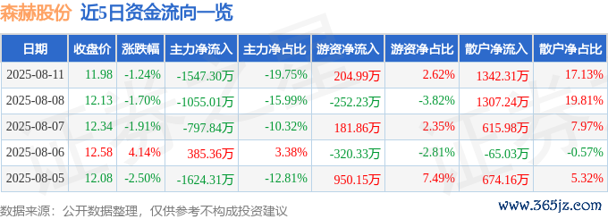 本站音问,扬弃2025年8月11日收盘,森赫股份(301056)报收于11.98元,下降1.24%,换手率3.7%,成交量6.52万手,成交额7836.17万元。