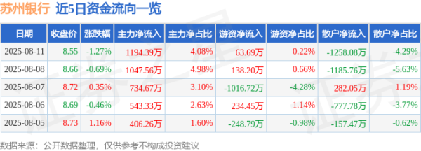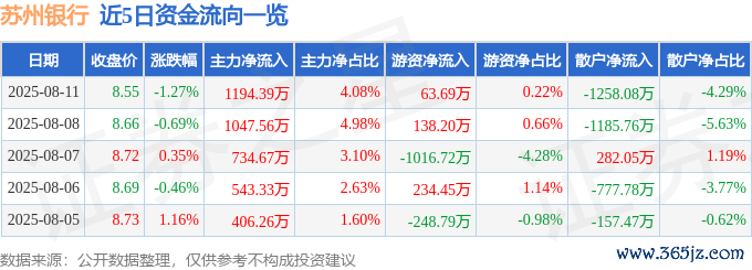 本站音问,放弃2025年8月11日收盘,苏州银行(002966)报收于8.55元,下落1.27%,换手率0.78%,成交量34.15万手,成交额2.93亿元。